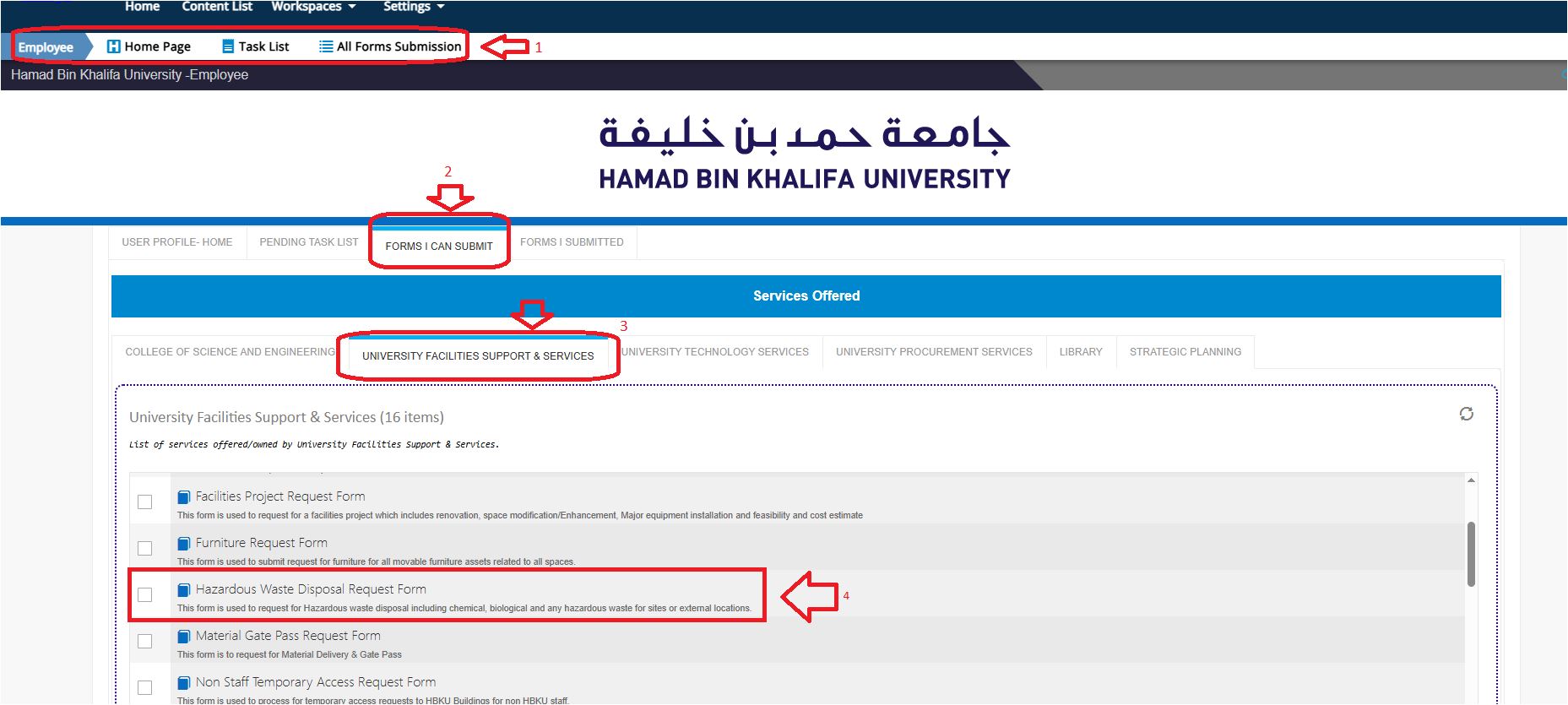 - Click on EMPLOYEE > FORMS I CAN SUBMIT > UNIVERSITY FACILITIES SUPPORT & SERVICE.