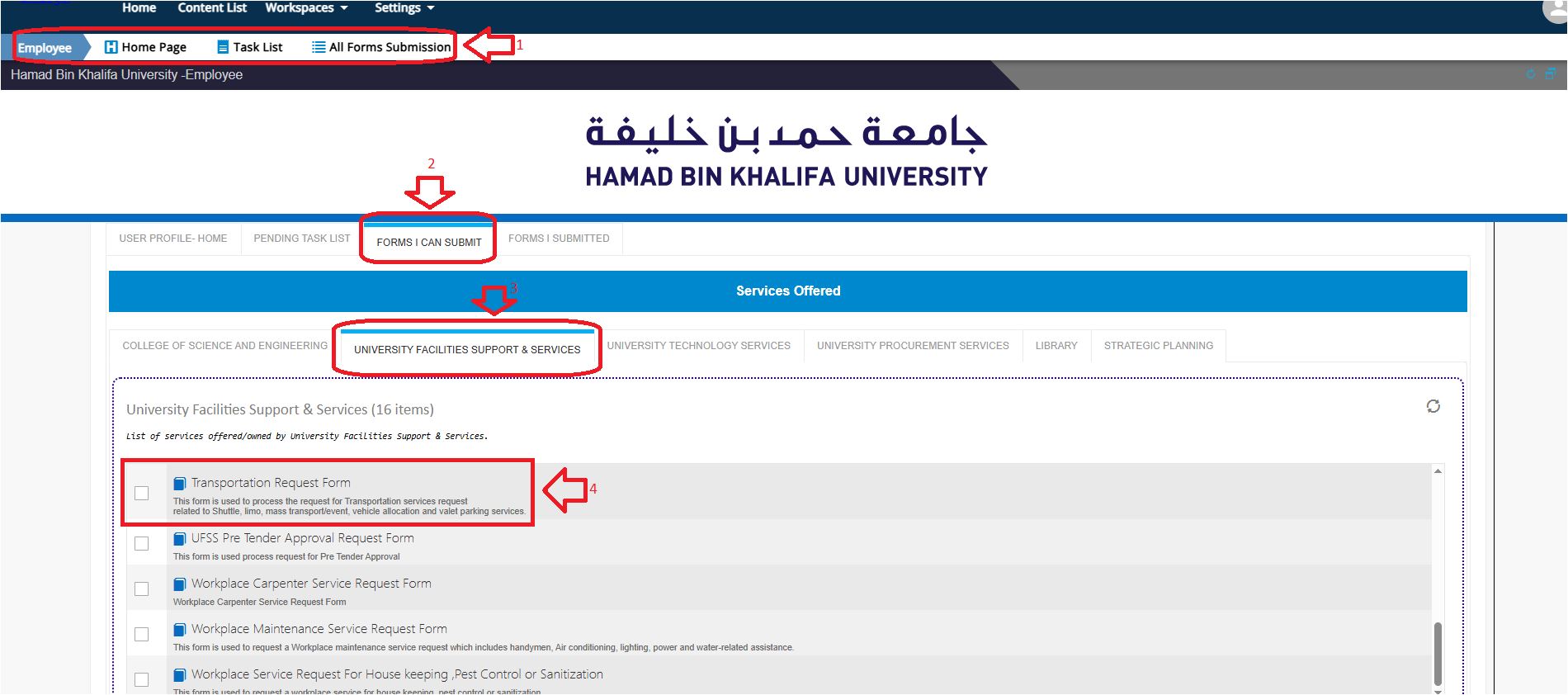 - Click on EMPLOYEE > FORMS I CAN SUBMIT > UNIVERSITY FACILITIES SUPPORT & SERVICE.