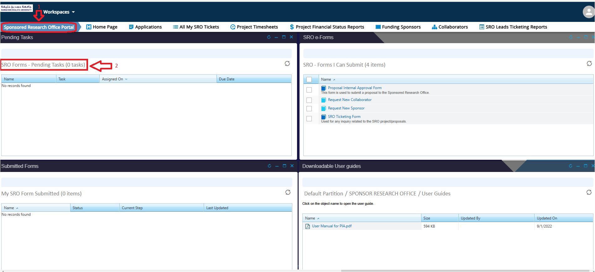- The SRO Project Timesheets for each month will appear in the “SRO Forms – Pending Tasks” window section.