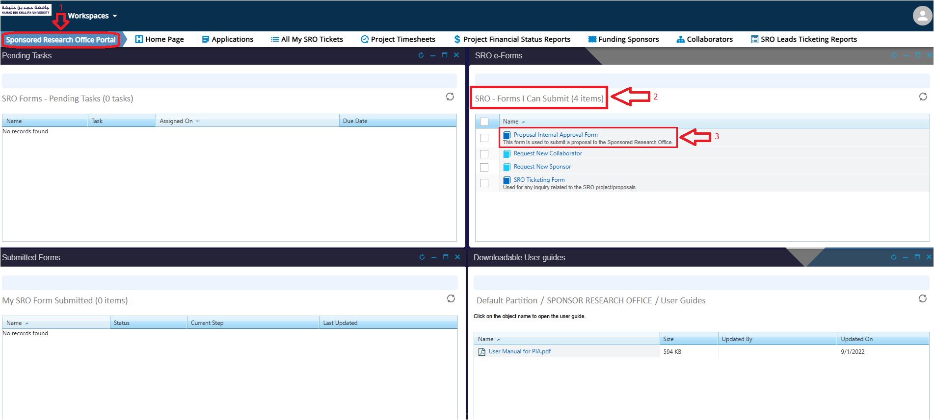 - Click on the Sponsored Research Office Portal, and under the section SRO Forms- I Can Submit, click on the Proposal Internal Approval (PIA) form.